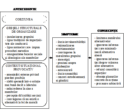 Presupunerea care sta la baza folosirii grupului in luarea deciziilor este ca grupul imbunatateste calitatea deciziei. Procesul decizional de grup este privit ca un proces rational in care se selecteaza alternativa maximi-zatoare pentru realizarea scopului grupului, indiferent care interese particu-lare din grup favorizeaza acea alternativa. Beneficiile asociate rezolvarii in grup a problemelor includ o mare varietate a perspectivelor asupra problemei, mai multa informatie privind alternativele posibile, reducerea subiectivismelor, reducerea pozitiilor extreme, etc. Fenomenul groupthink (Janis, 1972, 1981) impiedica realizarea acestor beneficii potentiale ale grupului determinand: (a) pasivitatea membrilor sai; (b) prematura convergenta a membrilor la o decizie a grupului si (c) escaladarea adeziunii fata de alternativa aleasa. Janis defineste groupthink ca un mod de gandire in care se angajeaza oamenii, cand sunt profund implicati intr-un grup inchis, coeziv, in care motivatia membrilor de a obtine si pastra unanimitatea depaseste motivatia lor de a aprecia, realist, cursurile alternative de actiune. Groupthink - precizeaza Janis, 1982 - se refera la deteriorarea eficientei mentale, a eficientei testarii realitatii si a eficientei judecatii morale, care rezulta din presiunile dezvoltate in grupul inchis.