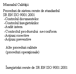 Prevederile Sistemului de Management al Calitatii sunt prezentate in Manualul de Management al Calitatii si in procedurile aferente si sunt obligatorii, din momentul aprobarii, a fi aplicate la toate nivelele de conducere si de executie din S.C. ABC S.R.L.