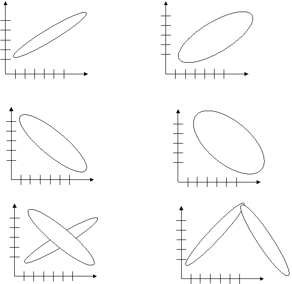 Fig. 4.10. Tipuri de corelatii: a). puternic pozitiva; b) pozitiva slaba; c) puternic negativa; d) negativa slaba; e) nu exista corelatie; f) corelatie neliniara.