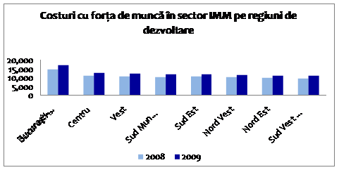 Cu exceptia sectorului IMM din regiunea Bucuresti-Ilfov, costurile cu forta de munca sunt relativ apropiate in toate regiunile de dezvoltare atat in 2008, cat si 2009