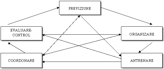 Putem vorbi astfel de functia de previziune, care are in vedere obiectivele, programarea muncii, dezvoltare etc. si se realizeaza prin intermediul diagnozei, prognozei, planificarii si programarii productiei. Functia de organizare, care asigura stabilirea sarcinilor pe baza rationala, stabilirea legaturilor de autoritate, de cooperare si de informare ce unesc oarnenii in cadrul sistemului; functia de coordonare definita prin adaptabilitatea organizatiei la conditiile existente in fiecare moment; functia de antrenare care se refera la modul de comanda si la motivarea personalului si functia de control prin intermediul careia se realizeaza evaluarea rezultatelor prin masurarea realizarilor, compararea acestora cu obiectivele stabilite si surprinderea elementelor pozitive si negative.