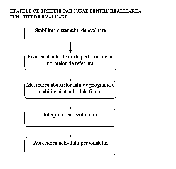 Prin control, performantele unui sistem si al componentelor acestuia sunt comparate cu obiectivele, pe baza anumitor criterii si standarde stabilite initial, in vederea preitampinarii aparitiei de disfunctionalitati si a eliminsrii deficientelor constatate. Realizarea functiei de evaluare presupune patru actiuni specifice, succesive: