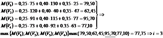 Daca agentia utilizeaza vaianta V1 atunci, in raport cu strategiile concurentei ea are profiturile: 75, 130 si, respectiv 25; daca utilizeaza varianta V2, atunci profiturile vor fi 120, 40, si respectiv 47; daca utilizeaza varianta V3, atunci profiturile vor fi 91, 115, si respectiv 77, iar daca utilizeaza varianta V4, atunci profiturile vor fi 73, 92, si respectiv 63.