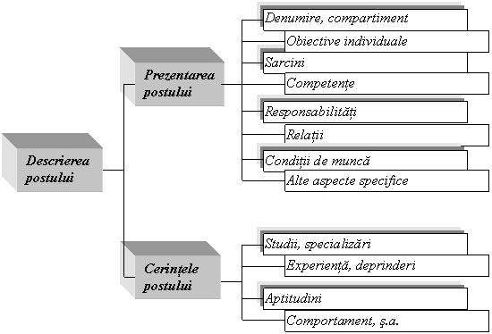 b) Descrierea postului sau fisa postului, cuprinde in detaliu toate elementele necesare unui angajat pentru a indeplini corect sarcinile postului ocupat. Continutul descrierii postului cuprinde atat prezentarea postului cat si cerintele fata de ocupantul postului si poate fi prezentat schematic in fig. nr.1.17.