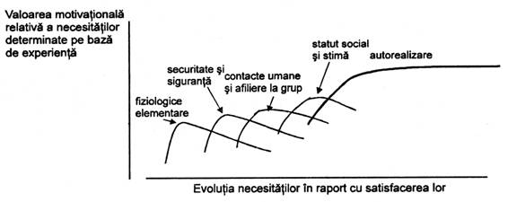 c) sa fie gradual, adica sa satisfaca succesiv necesitatile personalului si in stransa corelatie cu aportul sau, tinand cont de interdependentele dintre diferitele categorii de necesitati. Dupa cum rezulta din graficul prezentat in fig.1.2, o necesitate de ordin inferior trebuie satisfacuta inainte ca urmatoarea, mai intensa, sa se poata manifesta la nivel maxim. Caracterul gradual al motivarii este cerut si de volumul limitat al resurselor materiale utilizabile pentru motivare. Din examinarea graficului reiese si o alta concluzie foarte importanta si anume ca singurele necesitati care nu se epuizeaza sunt cele de autorealizare, adica nemijlocit legate de procesul si rezultatele muncii depuse, de recunoasterea lor sociala, de manifestarea plenara a personalitatii salariatilor respectivi.