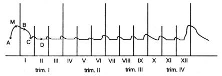 Evolutia ciclica a intensitatii functiei de previziune, reprezentata in figura 1.5, se caracterizeaza prin puncte maxime in perioada ce precede incheierea principalelor subdiviziuni temporale (an, trimestru, luna). Inregistrarea maximului inaintea inceperii unei noi perioade de activitate - de exemplu, punctul M pe arcul AC - corespunde momentului definitivarii, pe baza rezultatelor studiului pietei si a contractelor si comenzilor realizate, a planului sau programului pentru perioada urmatoare si adoptarii deciziilor vizand asigurarea conditiilor economice, tehnice etc., in vederea realizarii lui. Se mentine o intensitate apreciabila a acestui proces si in prima perioada de plan, arcul BC, in care are loc efectuarea ultimelor retusari pentru planul anual al firmei, stabilirea planurilor pentru diferitele sale componente si a programelor de productie pentru perioada imediat urmatoare. In continuare, in perioada corespunzatoare arcului CD intensitatea proceselor previzionale se diminueaza si mai mult, acestea reducandu-se, de regula, la actiuni premergatoare elaborarii previziunilor pe termen lung, mediu si scurt ce se vor adopta in viitor si la stabilirea de modificari de detaliu asupra obiectivelor si resurselor cuprinse in planul sau programul pentru perioada imediat urmatoare, in vederea reflectarii ultimelor evolutii endogene si exogene firmei si in special a celor survenite pe piata. In continuare, graficul indica o evolutie similara a intensitatii proceselor previzionale pentru fiecare trimestru si luna, evident cu o amplitudine mai mica.