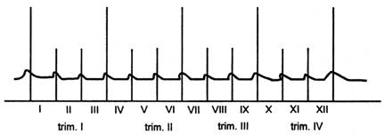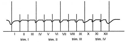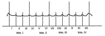 b) amplificarea intensitatii evaluarii-controlului in special la inceputul si sfarsitul subdiviziunilor temporale utilizate in previzionare, cand se determina nivelul realizarii obiectivelor si se definitiveaza obiectivele agentului economic pentru perioada urmatoare (fig.1.9).