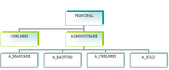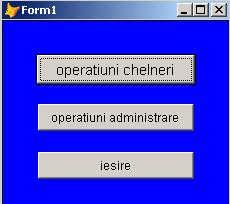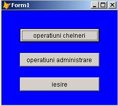 Formularul PRINCIPAL prezinta optiunile esentiale: "operatiuni chelneri", "operatiuni administrare" si "iesire" care fac legatura cu formularele CHELNERI si cu ADMINISTRARE si realizeaza inchiderea completa a programului.