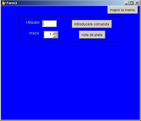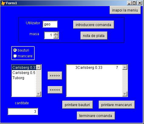 Pentru a putea introduce comanda trebuie ca in campul "utilizator" sa se introduca user-ul atribuit de catre administrator chelnerului. Dupa care se selecteaza numarul mesei si se apasa pe "introducere comanda".