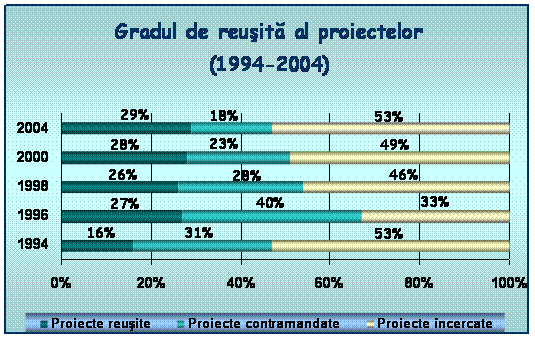 Totusi, s-a inregistrat un numar de 137.000 de proiecte ce depasesc bugetul planificat si timpul estimat, in timp ce alte 65.000 de proiecte au esuat cu desavarsire. Motivul pentru care cele mai multe dintre acestea au esuat nu a fost lipsa banilor sau a tehnologiei, ci lipsa unei conduceri de proiect competente si a suportului conducerii executive.