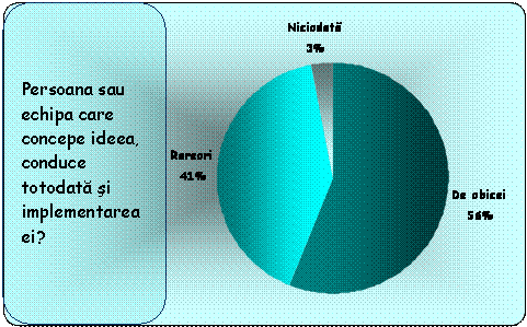 In studiul Optimize realizat pe 113 profesionisti in afaceri si tehnologie 44% dintre ei au raspuns ca persoana sau echipa ce are o idee de proiect conduce rar sau niciodata implementarea (figura 18). Faptul ca cei care au idei le duc pana la productie este o exceptie. Intrebati cine din companie are idei de proiecte, 63% au raspuns ca: manageri sau directori; 37% vicepresedintii de IT; 35% manageri de departament IT si alti sefi de departamente. Multi manageri chestionati au raspuns ca directorii de la acele nivele executa proiectele, deci este in atributiile lor sa conduca initiativele.
