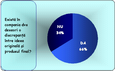 Am crede ca asa se intampla. Dar toata lumea cunoaste jocul de copii "telefonul fara fir" in care un copil sopteste ceva altui copil, iar acesta sopteste mai departe. Pana ajunge mesajul la ultimul copil este uneori foarte diferit de mesajul original. Desi ideile intr-o corporatie si planurile de proiecte nu trec prin asa de multe nivele, rezultatul final este foarte diferit de ideea originala, asa cum au spus doua treimi din cei chestionati (figura 19).