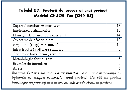 Cel mai important aspect al acestei cercetari este determinarea cauzelor ce duc la esecul proiectelor. Pentru aceasta grupul Standish a chestionat manageri executivi de IT pentru a afla opinia lor cu privire la cauzele care duc la reusita proiectelor. Principalele trei motive ce conduc la succesul unui proiect, in anul 1994, au fost: implicarea utilizatorilor, suportul conducerii executive si declararea clara a cerintelor (tabelul 23). Exista si alte criterii de succes, dar indeplinirea celor trei enumerate mai sus creste semnificativ sansele de succes ale oricarui proiect. Fara ele, sansele de reusita scad dramatic.