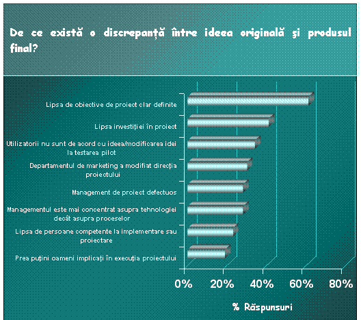 Cand studiul Optimize a intrebat de ce exista o discrepanta asa de mare intre idea originala si rezultatul final (figura 20) raspunsul a fost lipsa de obiective de proiect clar definite (61% din manageri). Pe lista mai erau si: lipsa investitiei in proiect (41%), utilizatorii nu sunt de acord cu ideea/modificarea idei la testarea pilot (34%), departamentul de marketing a modifiat directia proiectului (30%), management de proiect defectuos (28%).