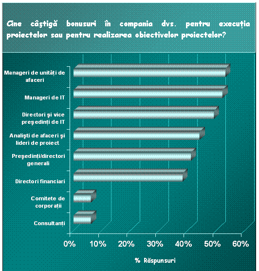 Mai mult de jumatate din toate companiile studiate rasplatesc manageri de unitati de afaceri si directori (53%), manageri de IT si sefi de departamente (52%). La fel de multi gasesc bani sa plateasca bonusuri directorilor si vice presedintilor de IT (49%) si analistilor de afaceri si liderilor de proiect (44%). Doar cativa platesc bonusuri tuturor celor din comitetele de corporatii sau consultantilor (6%) (figura 22). Desi inovarea poate sa fie inclusa in fisa postului, aceste companii cred ca plata in plus pentru rezultate bune rezulta in castiguri pentru companie, mai ales daca angajatii au facut imposibilul pentru a termina cu bine un proiect.