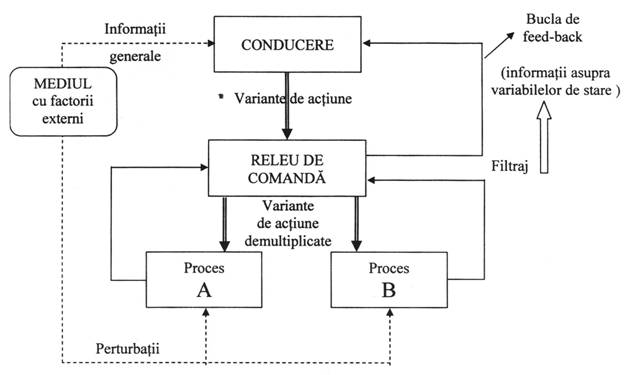 De altfel, adoptarea deciziilor trebuie inteleasa ca un proces iterativ. Pentru a evita ca aceeasi informatie sa induca actiuni divergente la diverse nivele de decizie, informatia trebuie transmisa in timp util si sub forma adecvata. Procesul iterativ de luare a deciziilor presupune existenta unui organism (releu) de comanda (fig.2) care sa prelucreze si sa demultiplice deciziile spre nivelele de executie si - in acelasi timp - sa filtreze informatiile de la esaloanele inferioare si sa le transmita sintetic prin bucla de feed-back catre conducere.