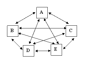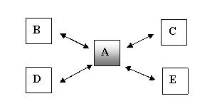 Daca se ia ca exemplu un grup format din cinci persoane, care lucreaza in acelasi compartiment sau la acelasi proiect, intre membrii acestuia se pot constitui urmatoarele tipuri de retele: roata (figura 3), Y (figura 4), lant (figura 5), cerc (figura 6) si stea (figura 7). Simbolul A reprezinta persoana centrala (managerul sau seful de proiect), pe la care trece cea mai mare parte a informatiilor.