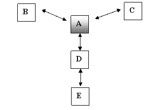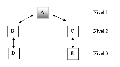 (Persoanele de la nivelul 3, D si E, comunica cu persoanade la nivelul 1, A, prin intermediul persoanelor de la nivelul 2 , B si C. Sistemul creeaza liniile si treptele ierarhice. In acest tip de retea se diminueaza sensibil posibilitatile de comunicare manager-subordonat).
