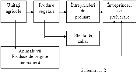 De regula, relatiile cu unitatile agricole se desfasurau prin intermediul unor intreprinderi de preluare a produselor, mai cu seama a celor vegetale. In cazul animalelor vii si al produselor de origine animaliera relatiile erau, in general, directe. Simplificand, relatiile dintre intreprinderile de prelucrare si unitatile agricole se infaptuiau potrivit schemei de mai jos (schema nr. 2).