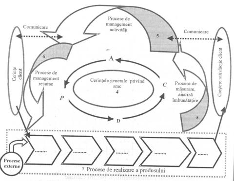 Modelul unui sistem de management al calitatii bazat pe proces prezentat in figura 1. ilustreaza legaturile intre procesele prezentate . aceasta figura arata rolul semnificativ pe care clientii il joaca in definirea cerintelor ca elemente de intrare. Monitorizarea satisfactiei clientului necesita evaluarea informatiilor referitoare la perceptia clientului asupra faptului ca organizatia a satisfacut cerintele sale. Modelul prezentat in figura 1. cuprinde toate cerintele acestui Standard International, dar nu prezinta procesele la un nivel detaliat.[8]