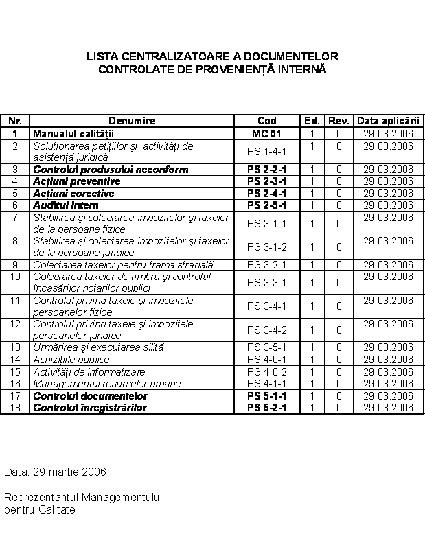 4. Elementele de sistem auditate constatari si rezultate ale auditorilor interne effectuate si modul de rezolvare stadiul actiunilor corrective si preventive actiuni de urmarire de la analizele effectuate recomandari si directii potentiale de imbunatatire 5. Document de referinta SR EN ISO 9001:2001 Manualul Calitatii Legea nr. 188/1999 privind Statutul functionarilor publici Legea nr. 571/2003 privind Codul de Procedura fiscala H.C.L.M 500/2006 |