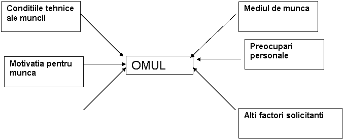 Aceasta definitie corespunde sistemului "om-solicitari", in care omul ocupa locul central, fiind nevoit sa raspunda solicitarilor tuturor factorilor (fig. nr.1). Au fost facute multe clasificari si grupari ale factorilor solicitanti, esential fiind insa faptul ca intre actiunea simultana a acestor factori si capacitatea organismului omenesc trebuie sa se realizeze un echilibru permanent.