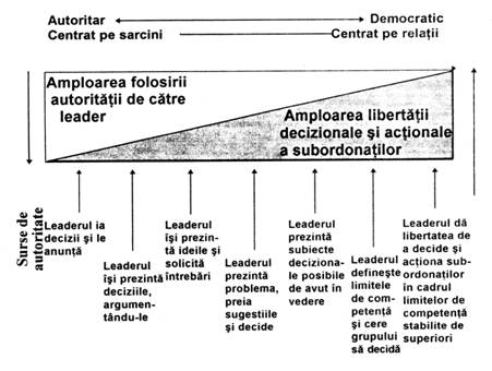 In functie de categoria de persoane intalnita, leaderul foloseste diferite tipuri de putere. Astfel, potrivit lui P. Hersley si K. Blanchard, pentru persoanele din prima categorie se recomanda apelarea la puterea coercitiva' de care dispune ca sef. In schimb pentru persoanele din ultima categorie, apte si doritoare sa se implice, leaderul recurge la puterea sa ca expert. Pe parcursul fazelor mentionate tratand cu persoane manifestand grade diferite de disponibilitati, leaderul in exercitarea leadershipului imbina deciziile, comportamentele si actiunile centrate pe realizarea sarcinilor, cu cele ce sintetizeaza pe primul plan dimensiunea umana a relatiilor cu celelalte persoane. Asa cum reiese din examinarea figurii nr. 6, cele doua aspecte sunt complementare, diferitelor proportii de utilizare a autoritatii leaderului, si respectiv, de acordare a libertatii de decizie si actiune subordonatilor corespunzandu-le anumite tipuri de interventii decizionale si comportamentale ale leaderului.