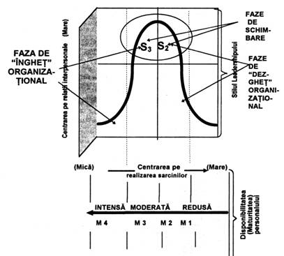 Intr-un alt stadiu al leadershipului in situatia cresterii gradului de pregatire si motivare a personalului, a autodisciplinarii sale si a sporirii responsabilitatii, scade preocuparea leaderului pentru realizarea sarcinilor, in conditiile unor intense relatii interpersonale. Aceste doua faze corespund, de regula, stilurilor de leadership democratice, participative si simbiotice. Ultima structura se manifesta, de regula, pe fondul continuarii perfectionarii calitatii personalului si a sistemului managerial, inregistrandu-se o diminuare a intensitatii relatiilor interpersonale cu manifestarea unei preocupari relativ reduse pentru sarcinile de realizat. Acestor elemente le corespunde stilul de leadership laissez-faire sau un stil democratic bazat pe o intensa delegare. Optarea pentru unul sau altul din stilurile de leadership prezentate depinde de caracteristicile de leader ale managerului, de situatia manageriala si, indeosebi, asa cum rezulta din grafic, de disponibilitatea sau maturitatea personalului implicat. Cu cat acesta este mai matur in conceptii si comportament si mai disponibil pentru efort si rezultate, cu atat leadershipul acorda o atentie mai mare elementelor umane cu rezultate superioare. In mod firesc, probleme deosebite se ridica in planul leadershipului atunci cand in organizatie se produc mari schimbari. In acest caz leadershipul este necesar sa ia in considerare cele trei faze specifice ale oricarui proces de schimbare: "dezghetarea" sistemului actual, schimbarea sa efectiva si "reinghetarea sa", prin decizii, regulamente etc. Edificatoare pe acest plan sunt elementele cuprinse in tabelul nr. 4.3.