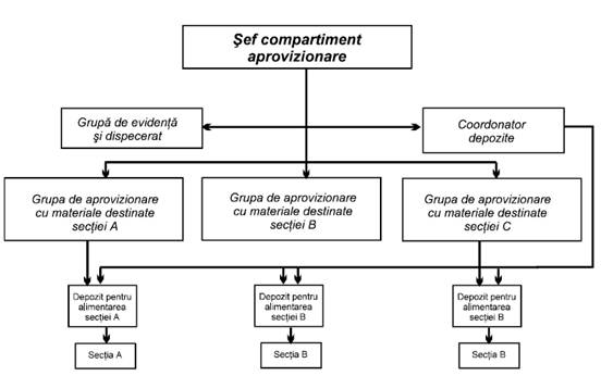 Derularea normala a proceselor de aprovizionare necesita organizarea, in cadrul structurii manageriale a unitatilor industriale, a unui compartiment de specialitate constituit sub forma de divizie, directie, departament, serviciu, birou, in functie de volumul si profilul de activitate, forma de organizare si marimea firmei (corporatie, concern, companie, trust, regie autonoma, societate comerciala pe actiuni sau cu raspundere limitata s.a.). Acestui compartiment, in functie de natura activitatilor care ii sunt specifice, trebuie sa i se asigure o organizare interna rationala.