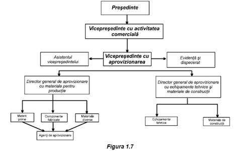 Intre aceste departamente se stabilesc relatii reciproce. Prin aceste relatii de colaborare intre departamente se are in vedere armonizarea desfasurarii activitatilor care le sunt specifice in scopul evitarii perturbatiilor, dereglarilor, necorelarilor care ar avea implicatii directe asupra procesului de aprovizionare materiala in ansamblul sau. Totodata, se creeaza conditii pentru informarea reciproca asupra stadiului realizarii diferitelor activitati. Se furnizeaza date si informatii care inlesnesc derularea acestora in concordanta cu programele stabilite. O asemenea structura de organizare suporta frecvente modificari in functie de conditiile noi care apar pe parcursul desfasurarii acestor activitati. Tendinta spre gigantism in dezvoltarea unitatilor economice amplifica la dimensiuni importante structura organizatorica a compartimentului de asigurare cu materiale, crescand riscul unei coordonari neeficiente a procesului de aprovizionare in ansamblul sau, data fiind marea varietate de activitati pe care le cuprinde, complexitatea acestora si gradul de dificultate sporit in realizarea lor (stapanirea corecta a cunostintelor necesare conducerii departamentelor specifice fiind dificila). Se creeaza, astfel, conditii ca un angajat pregatit insuficient sa poata folosi functia pe care o detine pentru a lua decizii care pot genera consecinte nefavorabile pentru activitatea unitatii in numele careia actioneaza. La nivelul unei corporatii [57] structura organizatorica a conducerii aprovizionarii materiale se prezinta in figura 1.7.