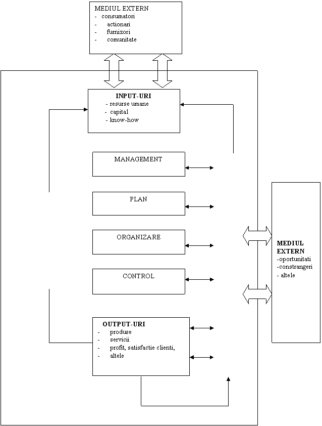 In conceptul de sistem, organizatia apare ca un intreg format din elemente care se interconditioneaza si in care mediul extern, prin interactiunea cu acest sistem, ii da caracteristica de sistem deschis.