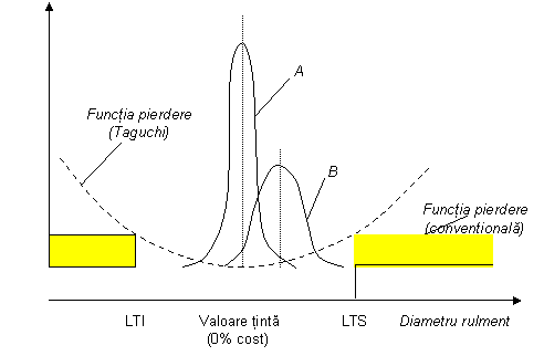 In aceasta figura se observa diferenta dintre functia pierdere definita de metoda conventionala si functia pierdere introdusa de Taguchi, aceasta din urma fiind dependenta de deviatia fata de o valoare ideala sau tinta a parametrului de proiectare. Valoarea T reprezinta valoarea tinta sau valoarea optima de obtinut pentru parametrul considerat. Acest parametru poate fi o caracteristica de calitate critica: diametru, calitatea suprafetei, spectru de culoare, etc., care contribuie la perceptia consumatorului privind calitatea.