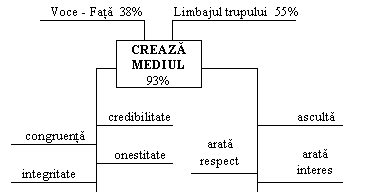 Componenta nonverbala a comunicarii este critica in schimbarea de atitudini, studiile de specialitate aratand ca numai 7% din efecte s-au obtinut datorita continutului verbal al mesajului, in timp ce 38% s-au datorat caracteristicilor vocii (inflexiuni, ton, calitate, viteza de vorbire) si expresiei faciale si 55% limbajului trupului. Aceste rezultate ne permit sa formulam 'reteta' comunicarii eficace sintetizata in schema de mai jos: