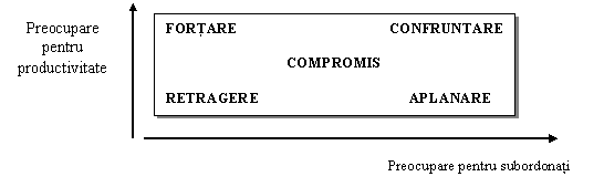 Oricum, atunci cind indivizii sau grupurile renunta la colaborare fireste ca starea conflictuala domina. Aceasta tehnica a cooperarii este desemnata sa reduca perceptiile gresite, sa stimuleze comunicarea corecta si sa dezvolte sentimente de incredere intre membrii organizatiei respective. De altfel, cei doi autori prezinta si alte cinci moduri de abordare a conflictului, pornind de la doua dimensiuni organizationale: preocuparea pentru rezultate (productivitate) si preocuparea pentru subordonati.