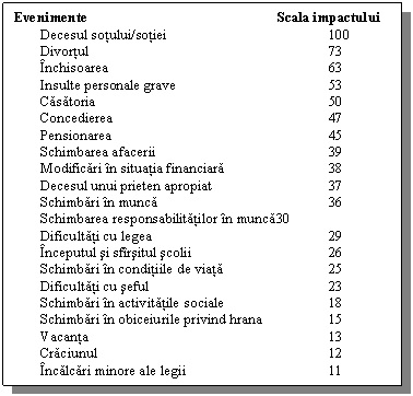 Este bine de retinut ca diferitele evenimente ale vietii pot deveni factori de stres care nu trebuie neglijati. Un studiu celebru realizat de dr. Thomas S. Holmes si colegii sai de la Universitatea din Washington a pus in evidenta o ierarhie a socurilor din viata de zi cu zi care pot induce stresul. Stabilind criteriul referinta la 100 de puncte pentru moartea unei persoane dragi (sotul sau sotia), specialistii acestei universitati au evaluat cu 73 de puncte divortul, inchisoarea cu 63, pensionarea cu 45, schimbarile in munca cu 36, schimbarea responsabilitatilor in munca cu 29, iar incalcarile minore ale legii cu 11 puncte. Alte exemple in fig.4.