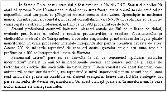 Desfasurarea in conditii optime a activitatii manageriale, caracterizata prin excelenta de responsabilitate marita odata cu statutul ocupat in cadrul unei ierarhii organizationale, necesita o stare de sanatate buna din partea conducatorului. Din acest motiv preocuparea specialistilor in management este indreptata tot mai mult si asupra elementelor din mediul intern si extern al organizatiei care pot diminua capacitatea de indeplinire a atributiilor. Afectiunile aparatului cardiovascular, respectiv a sistemului digestiv, mai frecvent intilnite la managerii contemporani, reprezinta tributul platit stresului - un pret apreciabil pentru succesul economic al organizatiilor pe care le conduc.