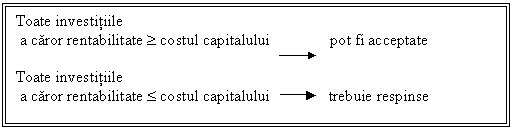 Decizia de investire a unui agent economic, respectiv decizia de a plasa capitaluri intr-o anumita operatiune, este rezultatul corelarii stranse dintre costul capitalului utilizat - propriu sau imprumutat - si rentabilitatea scontata.