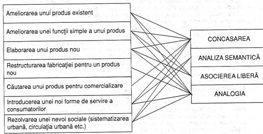 intuitive, intre care se numara: concasarea (descompunerea problemei de rezolvat in elementele sale componente pe baza unei grile de cercetare propusa de Osborn in vederea gasirii posibitatilor de utilizare noua, de modificare, substituire, rearanjare, inversare, combinare, amplificare, diminuare), analiza semantica, asocierea libera, analogia (utilizata pentru crearea de obiecte fizice, intelegerea fenomenelor naturii si a celor sociale); in functie de tipul problemei ce trebuie rezolvata, utilizarea acestor metode se poate face potrivit figurii urmatoare: