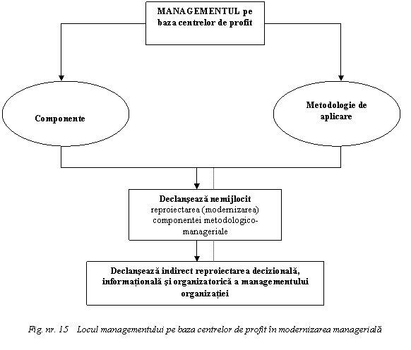 este un element declansator al unor actiuni complexe de modernizare manageriala. In pofida criticilor care i se aduc, in pofida unor limite pe care le inregistreaza, managementul pe baza centrelor de profit este, indiscutabil, punctul central al componentei metodologico-manageriale si al reproiectarii acesteia. De calitatea conceperii si aplicarii acestui instrument managerial depind decisiv calitatea si eficacitatea solutiilor manageriale oferite de reproiectarea subsistemelor decizional, informational si organizatoric. Figura prezentata in continuare este sugestiva in aceasta privinta.