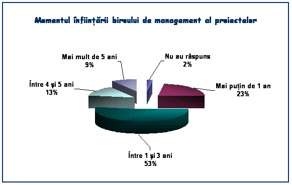 50% dintre cei chestionati spun ca ratele de succes ale proiectelor au crescut ca rezultat al infiintarii biroului de management al proiectelor (22% nu urmaresc aceasta influenta). In medie, ratele de succes ale proiectelor (definite ca terminarea in timp, in buget si cu toate specificatiile originale realizate) au crescut cu 46%.