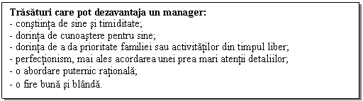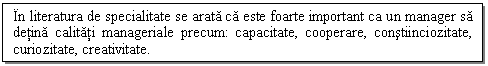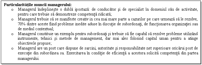 Prin activitatea pe care o desfasoara, managerul isi operationalizeaza cunostintele, calitatile si aptitudinile, pe care le poseda.