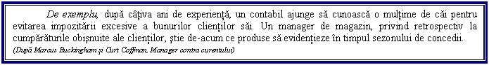 Cel mai eficient mod de a transforma talentul cuiva in performanta este de a-l ajuta sa-si gaseasca propria cale catre rezultatele dorite. In acest fel au de castigat si echipa, si persoana, si compania. Este stiut ca cel mai bun drum pe care natura l-a gasit pentru a ajunge de la un punct A la un punct B nu este neaparat in linie dreapta, ci este intotdeauna drumul care are de intampinat cele mai putin obstacole.