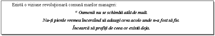 El este exemplul, el este oglinda rezultatelor companiei, iar schimbarea este un fapt al vietii moderne. Totul se afla intr-o continua dinamica. Climatul de afaceri este intr-o permanenta si rapida miscare, iar diferitele abordari de management apar si dispar.