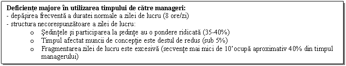 Poate ca cel mai mare dusman al unui manager este TIMPUL. Insa, timpul este si cea mai importanta resursa. In utilizarea acestei resurse, deseori apar deficiente majore, de ordin cantitativ si structural.