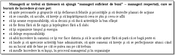 In acelasi timp, managerii trebuie sa aiba o temeinica pregatire manageriala, stiintifica, o reala capacitate de a conduce, dar si talent organizatoric.