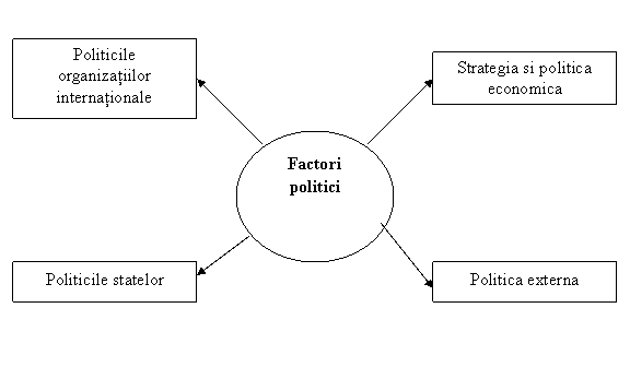 Factorii politici cuprind : strategia si politica economica a unei tari, politica externa a acesteia, politicile altor state si politicile organizatiilor internationale.