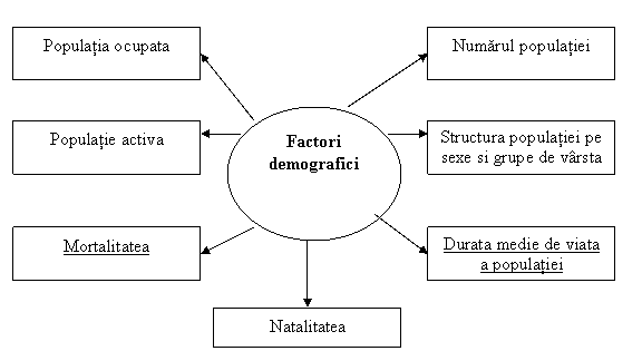Factorii demografici cuprind : numarul populatiei, structura populatiei pe sexe si grupe de varsta, durata medie de viata a populatiei, natalitatea si mortalitatea, populatia ocupata (numarul de persoane care au un loc de munca) si populatia activa (numarul de persoane care sunt apte de munca, dar nu au loc de munca), ponderea populatiei active in totalul unei tari.