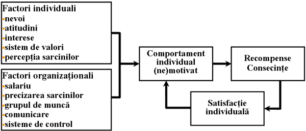 Motivatia pentru munca a unui individ este determinata de o serie de factori motivationali: intrinseci (individuali) si extrinseci (organizationali). In modelul general al motivatiei (Rotaru, Prodan, 1998) prezentat in figura 3. observam cum combinarea acestor factori va determina un comportament individual motivat (sau nu) in vederea obtinerii performantelor asteptate.