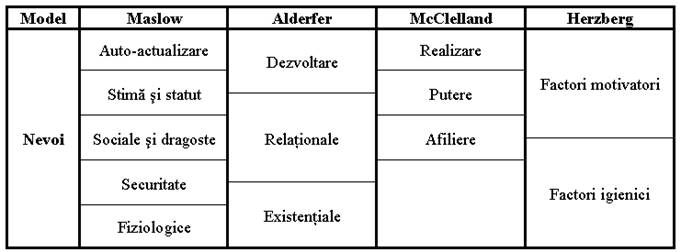 Figura 4. Comparatie intre modelele motivationale (Maslow, Alderfer, McClelland, Herzberg)