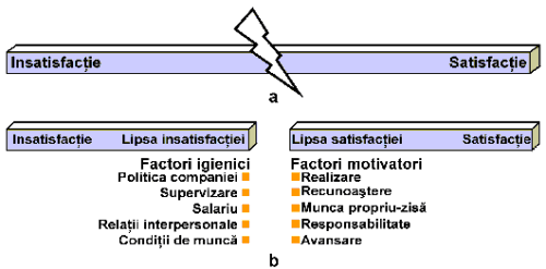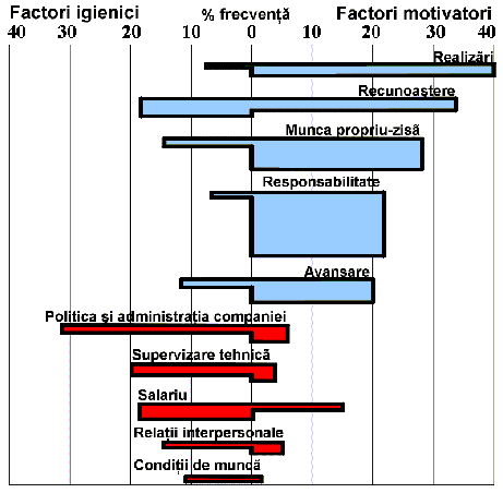 Studiul initial a fost realizat in baza interviurilor structurate cu 200 de ingineri si economisti din noua companii diferite. In cadrul interviurilor, acestia au fost solicitati sa-si descrie experientele de lucru in care s-au simtit foarte bine sau foarte rau si sa spuna cat timp au persistat astfel de sentimente fata de ceea ce li se intampla la locul de munca. Datele au fost inregistrate si incluse in categorii de evenimente care ii fac pe angajati sa dezvolte atitudini pozitive sau negative fata de locul de munca (tehnica incidentelor critice). Concluziile acestui studiu au condus la formularea unei distinctii intre doua categorii de factori prezenti la locul de munca (figura 5.):